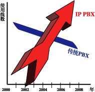 據(jù)美國(guó)“Yankee Group”預(yù)測(cè),“2005年IP-PBX的使用線數(shù)將超過(guò)傳統(tǒng)PBX。從2001年開(kāi)始傳統(tǒng)PBX以每年12%的速度在下降,IP-PBX以每年30%的速度增長(zhǎng)”。