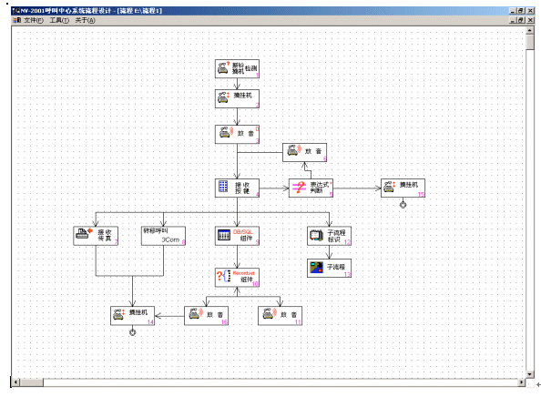 NV-IVR是一個(gè)使用方便、功能強(qiáng)大支持持續(xù)開發(fā)的開放式產(chǎn)品。NV-IVR運(yùn)用圖形化按鈕,直觀顯示各個(gè)子模塊的主題,使用者只要通過簡(jiǎn)單的拖曳、配置就可以生成一棵樹狀流程圖,直觀地對(duì)照IVR的實(shí)際運(yùn)行流程。用戶需要對(duì)實(shí)際流程進(jìn)行修改,只須對(duì)流程圖修建即可。NV-IVR可以完成以下一些主要功能: