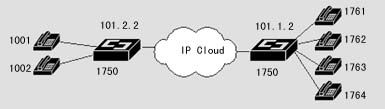 在該案例中,異地之間通過兩臺DCR 1750互連,并提供語音模塊,可直接接電話機,使得異地之間可以通過IP網(wǎng)絡(luò)撥打IP語音電話。