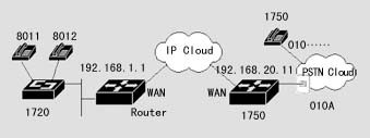 1720也可以通過器語音端口連接到PSTN,通過二次撥號,使得兩地的PSTN用戶可以通過IP網(wǎng)絡(luò)互相通話,而話費只是市話的費用。