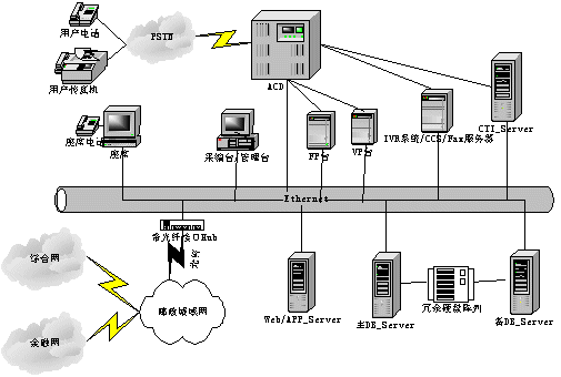 呼叫中心的功能主要有兩方面,一是與用戶進(jìn)行交互,另外與金融主機(jī)房進(jìn)行數(shù)據(jù)交互。呼叫中心系統(tǒng)由兩部分組成:聲訊平臺(tái)(CALL CENTER)和業(yè)務(wù)數(shù)據(jù)計(jì)算機(jī)網(wǎng)絡(luò)平臺(tái)。聲訊平臺(tái)由話務(wù)接入設(shè)備(ACD)、IVR系統(tǒng)和CTI服務(wù)器組成,主要負(fù)責(zé)語音資源的管理、呼入話務(wù)的排隊(duì)、自動(dòng)業(yè)務(wù)以及人工座席的管理等;業(yè)務(wù)數(shù)據(jù)計(jì)算機(jī)網(wǎng)絡(luò)平臺(tái)是對(duì)業(yè)務(wù)數(shù)據(jù)的收集、使用、管理、分析等。平臺(tái)間通過CTI技術(shù)實(shí)現(xiàn)數(shù)字?jǐn)?shù)據(jù)和語音數(shù)據(jù)的相互轉(zhuǎn)換和同步轉(zhuǎn)移。系統(tǒng)結(jié)構(gòu)如下。