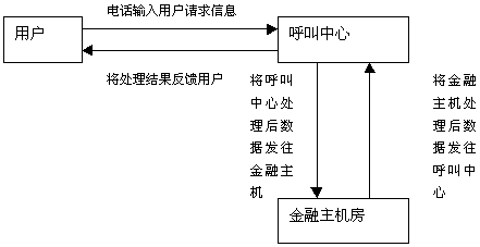 用戶通過撥打電話185連接到185客戶服務(wù)中 心,然后根據(jù)客戶服務(wù)中心的提示信息利用電話按鍵或語音輸入用戶的請(qǐng)求信息。用戶的請(qǐng)求信息傳送到呼叫中心后,呼叫中心會(huì)根據(jù)用戶的請(qǐng)求信息內(nèi)容進(jìn)行處理,如查詢儲(chǔ)蓄法規(guī)等,然后將處理結(jié)果反饋給用戶,如果牽涉到用戶的帳戶數(shù)據(jù),則呼叫中心將用戶的請(qǐng)求首先進(jìn)行處理,然后將處理后的信息發(fā)送給金融主機(jī)房,由金融主機(jī)根據(jù)呼叫中心傳來的數(shù)據(jù)進(jìn)行帳務(wù)處理,然后將處理結(jié)果返回給呼叫中心,呼叫中心再對(duì)金融主機(jī)房返回的數(shù)據(jù)進(jìn)行處理成客戶能夠聽到的語音信息,將處理結(jié)果傳給用戶。上述流程是一個(gè)單個(gè)處理流程,實(shí)際上跟用戶進(jìn)行交互時(shí),一項(xiàng)業(yè)務(wù)會(huì)有多個(gè)往返的處理流程。