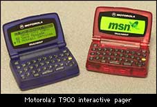 “Talkabout T900”是摩托羅拉公司為微軟MSN專門設(shè)計(jì)生產(chǎn)的一種雙向?qū)ず魴C(jī),它由一個(gè)緊湊型的小鍵盤和一個(gè)可以容納4行消息的屏幕組成,設(shè)計(jì)小巧,攜帶方便,可以方便用戶收發(fā)MSN提供的Hotmail免費(fèi)郵件服務(wù)、接收短消息以及訪問MSN上的其它服務(wù),比如及時(shí)的股市行情、警示消息等等。