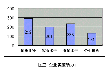 (d)提升企業(yè)形象:很多受訪企業(yè)特別是服務(wù)業(yè),已經(jīng)建立客戶忠誠度放在了很重要的位置,但比較其它幾個(gè)直接動因,比例偏低,這也似乎說明"以客戶為中心"的觀念還沒有"以利潤為中心"強(qiáng)烈。
