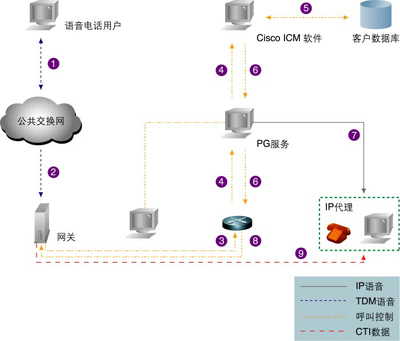 CallManager。(4)Cisco CallManager通過(guò)ICM PG把該路由申請(qǐng)送到ICM。(5)ICM檢查客戶的賬號(hào)信息,并通過(guò)對(duì)賬號(hào)信息的分析確定路由。(6)ICM調(diào)用一個(gè)客戶定義的路由腳本,以便選擇最合適的IPCC代理受理客戶的請(qǐng)求,并通過(guò)外設(shè)網(wǎng)關(guān)(PG)轉(zhuǎn)給目標(biāo)CCM。(7)PG發(fā)送客戶信息數(shù)據(jù)到目標(biāo)IPCC代理的桌面(在屏幕上彈出信息框)。(8)CCM指示VoIP網(wǎng)關(guān)連接客戶和目標(biāo)代理。(9)VoIP網(wǎng)關(guān)建立語(yǔ)音連接。