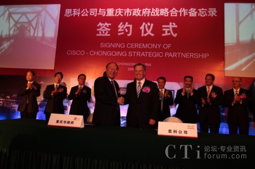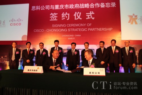CTI論壇(ctiforum)9月14日消息:2009年9月11日,重慶市人民政府與思科正式簽訂合作備忘錄,雙方將結(jié)為戰(zhàn)略合作伙伴關(guān)系,就通信產(chǎn)品制造、“智能+互聯(lián)城市”試點示范、綠色技術(shù)研發(fā)與創(chuàng)新及風(fēng)險投資等多方面展開深入合作。此次合作將進一步加快重慶市產(chǎn)業(yè)結(jié)構(gòu)和產(chǎn)品結(jié)構(gòu)調(diào)整,促進內(nèi)陸開放城市建設(shè);加快發(fā)展重慶通信產(chǎn)品產(chǎn)業(yè)集群,把重慶建設(shè)成為西部重要的現(xiàn)代通信產(chǎn)品制造基地;推動以信息產(chǎn)業(yè)為主體的重慶高新技術(shù)產(chǎn)業(yè)發(fā)展以及本土創(chuàng)新和可持續(xù)性能力的提供,更高效便捷地加快本土企業(yè)的國際化進程;整合多方國際資源,以推進重慶在中國率先成為“智能+互聯(lián)城市”,讓市民享受更多的工作和生活便利及實惠。作為思科在華創(chuàng)新及可持續(xù)發(fā)展戰(zhàn)略實施的又一里程碑,此次合作不僅是思科“智能+互聯(lián)城市”計劃在中國與當(dāng)?shù)卣氖锥群献黜椖,也是思科在“協(xié)作型創(chuàng)新模式”指導(dǎo)下激勵本土創(chuàng)新的全新實踐。