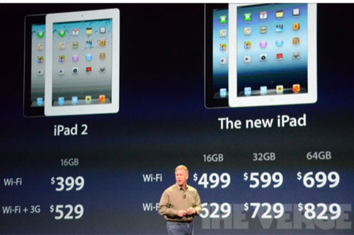 此次發(fā)布的新一代iPad分別為WiFi版16G/32G/64G,價格分別為499美元/599美元/699美元。同時蘋果新一代iPad還發(fā)布了LTE版本,同時向下支持HSPA+網(wǎng)絡,其中16G/32G/64G,價格分別為629美元/729美元/829美元。