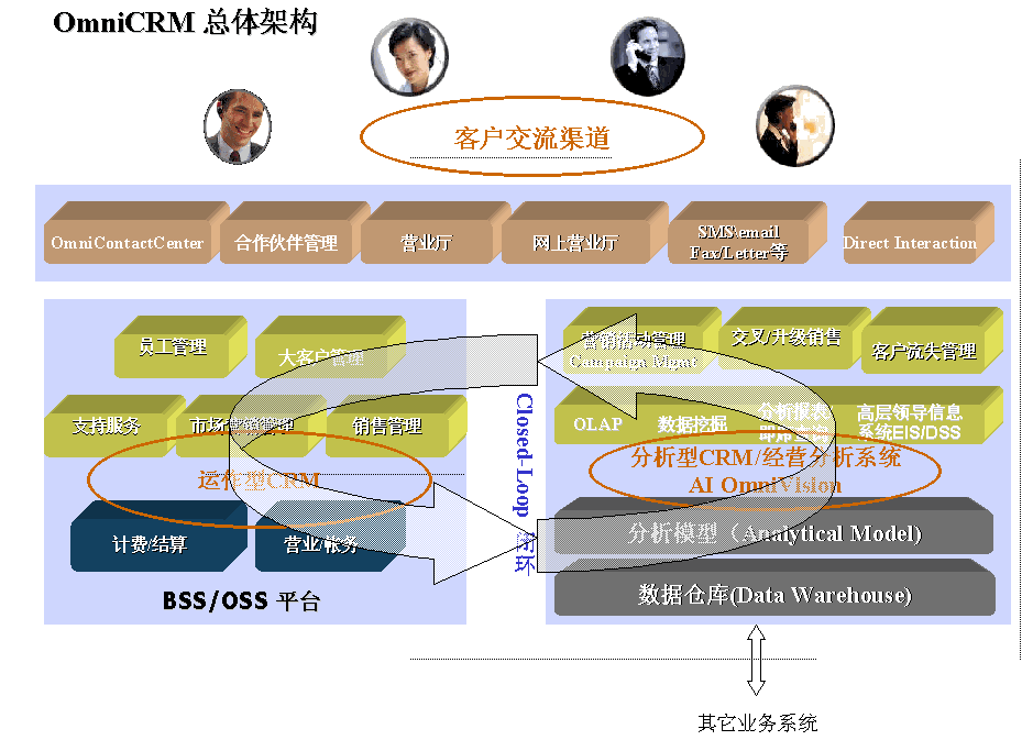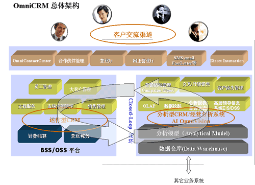 OmniCRM方案是亞信基于多年服務電信市場的豐富的行業(yè)經驗,以及對國內運營商業(yè)務發(fā)展的深刻認識而推出的,其中,AI OmniVision是OmniCRM方案中經營分析型CRM 的核心產品。AI OmniVision不僅符合行業(yè)業(yè)務規(guī)范,而且基于對客戶行為、競爭環(huán)境,商業(yè)獲利率以及其他參數(shù)的透徹分析,能夠使運營商充分了解現(xiàn)有客戶、識別并關注贏利的客戶組、提高服務質量、確?蛻魸M意度和忠誠度;同時吸引潛在的客戶;加強提供新服務的投資回報率;提高效率、減小成本,以實現(xiàn)業(yè)務價值的最大化。AI OmniVision采用數(shù)據(jù)倉庫、ETL、OLAP分析、靈活報表展現(xiàn)及數(shù)據(jù)挖掘等技術,包含了用戶分析、業(yè)務分析、收益分析、大客戶分析、營銷分析、競爭分析、服務質量、新業(yè)務分析等眾多功能模塊。