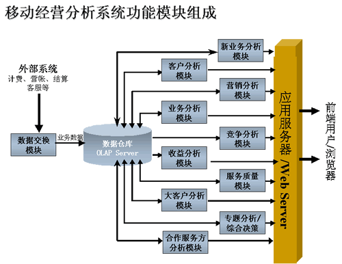 根據(jù)中國移動的業(yè)務特征,AI OmniVision分為用戶分析、業(yè)務分析、收益分析、大客戶分析、營銷分析、競爭分析、服務質量分析和綜合決策分析。同時在系統(tǒng)中還需要一些輔助模塊,以保證系統(tǒng)正常順利地運行。這些輔助模塊包括: