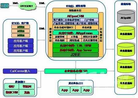 最底層為技術(shù)層次(TL),AIOpenCRM是完全依據(jù)J2EE實現(xiàn)的多層架構(gòu)的應(yīng)用軟件系統(tǒng)。因此在技術(shù)層面上是構(gòu)建于AIAppFrame產(chǎn)品上的,這是亞信自己提供的J2EE組件框架平臺,也就是開發(fā)平臺。在此平臺基礎(chǔ)上提供了大量的技術(shù)服務(wù)和組件,其中就包括工作流(或者和第三方工作流集成)、業(yè)務(wù)規(guī)則(包括引擎、配置工具)、接口框架、報表(模板、配置工具)、事件引擎等等。