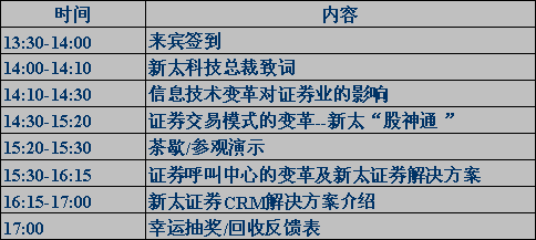 與高交會同期的還有10月15日下午在投資大廈4樓多功能廳舉行的新太“股神通”產(chǎn)品發(fā)布會暨證券業(yè)務(wù)解決方案研討會(詳細情況請看邀請函)。