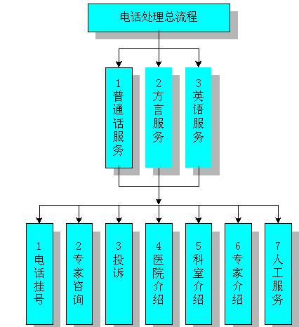 用戶撥號接入醫(yī)院呼叫中心后,系統(tǒng)自動向用戶播放語音提示:"您好,歡迎使用本醫(yī)院的電話服務(wù)中心,普通話服務(wù)請按1,方言(廣東話)服務(wù)按2,英語服務(wù)按3。"