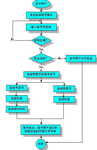 用戶選擇普通門診,系統(tǒng)繼續(xù)提示"請選擇科目,1內(nèi)科,2外科,3五官科,……,"用戶選擇完畢。系統(tǒng)提示:"您要掛的是*科,確認按1,重輸按2",用戶按1,系統(tǒng)繼續(xù)提示:"本院已經(jīng)為您記錄并生成號單,請于當日及時到醫(yī)院自助終端打印號單后就診。"