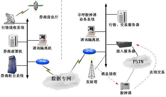 最終我們的設(shè)想是類似于呼叫中心的外包方式,由尋呼臺(tái)建立一套短訊接入系統(tǒng),并與券商的交易系統(tǒng)聯(lián)網(wǎng)(通過(guò)交易前置機(jī)),各券商租用部分資源,同時(shí)給他們的股民提供股神通話機(jī),股民們一方面可通過(guò)尋呼臺(tái)的無(wú)線資源接收股市信息,另一方面可以通過(guò)電話線接入尋呼的交易系統(tǒng)進(jìn)行交易。