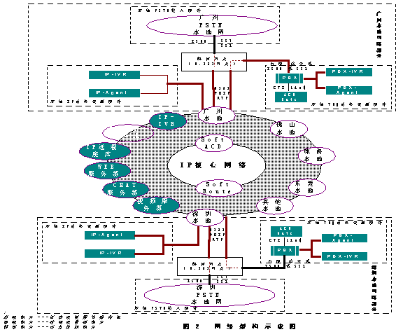 從網絡架構示意圖2中可以看到,每一個PSTN本地網都是通過H323媒體網關連接到IP包交換網絡,再接入到呼叫中心系統(tǒng)中來的,包括廣東省內各個比較重要的城市(如深圳,珠海,中山,東莞等等)都可以設一個H323媒體網關.同時所有的話務資源(如多媒體座席和IP-IVR系統(tǒng))都是直接通過IP網絡連接到呼叫中心系統(tǒng)中來的.