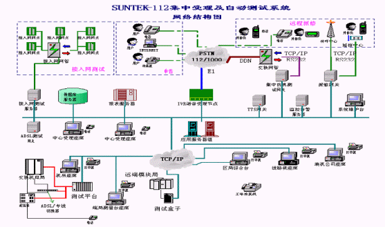系統(tǒng)在設(shè)計時采用集中受理、分布測量的結(jié)構(gòu)化、模塊化設(shè)計:受理中心進(jìn)行112的集中受理和業(yè)務(wù)處理,端局完成相應(yīng)用戶線的測試功能,所有測試數(shù)據(jù)等均送至受理中心。系統(tǒng)測試準(zhǔn)確、任務(wù)分擔(dān)、負(fù)荷均衡,處理速度快,性能可靠。系統(tǒng)的受理模塊和測試模塊相互協(xié)調(diào)又各自獨(dú)立,使二者可以統(tǒng)一地作為SUNTEKTM-112集中受理及自動測試系統(tǒng),又能各自作為子系統(tǒng)與其它廠家(112系統(tǒng)、97系統(tǒng)、1000號等)的產(chǎn)品結(jié)合起來為112系統(tǒng)服務(wù)。系統(tǒng)網(wǎng)絡(luò)結(jié)構(gòu)圖如下所示: