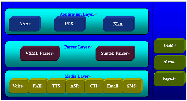 Layer提供具體的操作,主要是管理語(yǔ)音、傳真、IP等資源,對(duì)Browser Layer屏蔽掉硬件的區(qū)別,提供統(tǒng)一的接口,以插件的形式提供各種功能。在它們之外還有配置管理、維護(hù)監(jiān)控、告警管理、統(tǒng)計(jì)報(bào)表等。應(yīng)用服務(wù)器部分包括外呼管理、數(shù)據(jù)庫(kù)中間件,傳真網(wǎng)關(guān)、自然語(yǔ)音理解引擎等。具體的結(jié)構(gòu)見下圖: