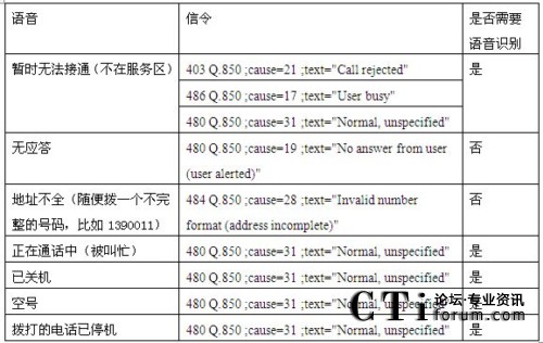 從歸納的情況看,只有無(wú)應(yīng)答和地址不全兩種情況是可靠信令分析來識(shí)別的,其他的5種情況都無(wú)法通過信令檢測(cè)識(shí)別。特別是暫時(shí)無(wú)法接通的語(yǔ)言提示,播放完提示音有3種不同的信令,應(yīng)該是屬于不同的情況,但是放了相同的語(yǔ)音。因此造成號(hào)碼識(shí)別錯(cuò)誤的現(xiàn)象。