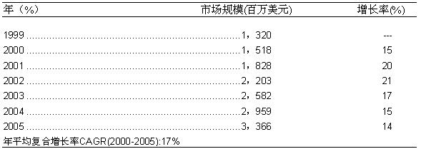 如圖一所示,1999年,美國(guó)的固定網(wǎng)OSS服務(wù)保障的市場(chǎng)規(guī)模約為13.2億美元。而在2000年,這一市場(chǎng)比上一年增長(zhǎng)了15%,達(dá)到15.18億美元。根據(jù)Frost & Sullivan的預(yù)測(cè),從2000年到2005年間,美國(guó)的固定網(wǎng)OSS服務(wù)保障市場(chǎng)的年平均復(fù)合增長(zhǎng)率將高達(dá)17%,市場(chǎng)規(guī)模在2005年預(yù)計(jì)會(huì)增長(zhǎng)至33.66億美元。