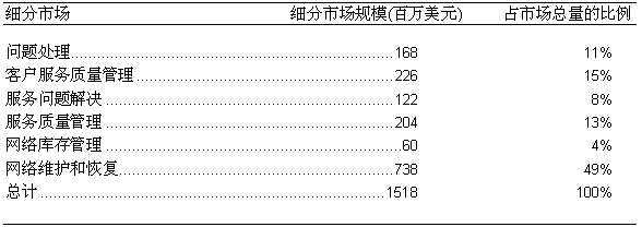 如圖二所示, 2000年, 在美國(guó)的固定網(wǎng)OSS服務(wù)保障市場(chǎng)的六個(gè)細(xì)分市場(chǎng)中, 規(guī)模最大的是網(wǎng)絡(luò)維護(hù)和恢復(fù)市場(chǎng), 市場(chǎng)總額約為7.38億美元, 占整個(gè)市場(chǎng)的49%; 而規(guī)模最小的是網(wǎng)絡(luò)庫(kù)存管理市場(chǎng), 市場(chǎng)總額約為6千萬(wàn)美元, 僅占整個(gè)市場(chǎng)的4%左右。