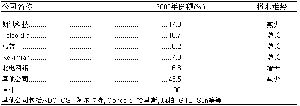 從目前市場(chǎng)情況來(lái)看,美國(guó)的固定網(wǎng)OSS服務(wù)保障的市場(chǎng)集中度相當(dāng)高。在市場(chǎng)中領(lǐng)先的公司一共有5家,它們分別是朗訊科技、Telcordia科技、惠普公司、Hekimian和北電網(wǎng)絡(luò)。這五家公司均是較早進(jìn)入這一市場(chǎng)的老牌公司。2000年,它們?cè)诠潭ňW(wǎng)OSS服務(wù)保障領(lǐng)域的銷售額總和為8.60億美元,約占整個(gè)市場(chǎng)的56.5%左右,另外43.5%的市場(chǎng)被約其他二十多家廠商分割。