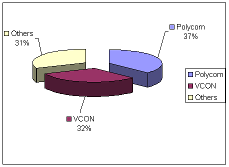 表4和圖3顯示了2001年桌面視頻會議市場競爭廠商銷售額市場份額,表2和圖2顯示了銷售量的市場份額。隨著新產(chǎn)品的和新廠商的進(jìn)入,競爭態(tài)勢將在未來不斷變化。目前該市場上兩個最大的廠商是Polycom和VCON, 其他一些小廠商市場份額較小。