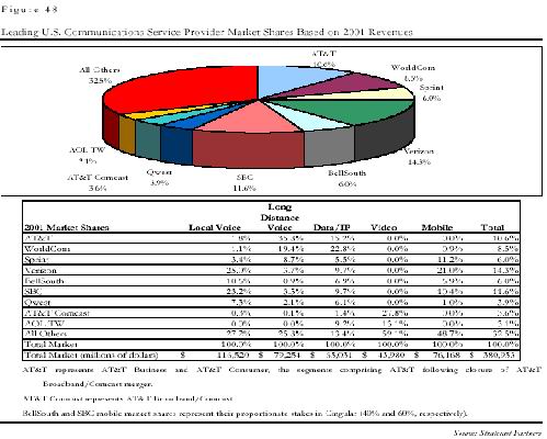 。∑髽I(yè)能力:由于沒(méi)有市話公司,AT&T缺乏對(duì)普通消費(fèi)者的最后一公里的接入手段。收購(gòu)地區(qū)性市話公司的可能性不大;而新建市話網(wǎng)絡(luò)成本巨大,不易成功。因此在2001-2002年,AT&T以超過(guò)1000億美元的巨資收購(gòu)了3家地區(qū)性的寬帶接入提供商,希望以此建立與普通消費(fèi)者的直接聯(lián)系。
