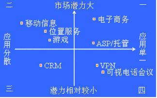。〉谌笙蓿菏袌(chǎng)潛力比較小,應(yīng)用比較分散。由于經(jīng)營(yíng)靈活,貼近客戶,小服務(wù)提供商在此會(huì)有非常大的優(yōu)勢(shì)。大型運(yùn)營(yíng)商如想經(jīng)營(yíng)此象限內(nèi)的業(yè)務(wù),必須努力減小不同用戶需求的差異,并造成成本領(lǐng)先。如客戶關(guān)系管理(CRM)。