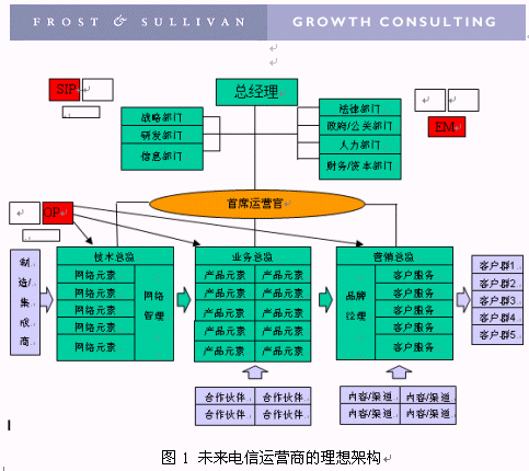 Frost & Sullivan(中國)公司深入研究國際主流運(yùn)營商的組織結(jié)構(gòu)與管理模式,同時(shí)參考了國際上公認(rèn)的eTOM模型,并結(jié)合國內(nèi)電信運(yùn)營商組織結(jié)構(gòu)的現(xiàn)狀,提出了圖1所示的未來電信運(yùn)營商的理想架構(gòu)。理想架構(gòu)的確定對(duì)電信運(yùn)營管理的變革具有重要的意義。只有事先明確了方向,并且對(duì)未來達(dá)成了廣泛一致的共識(shí),才能對(duì)目標(biāo)過程進(jìn)行分解,有步驟、有方法、有成效的完成目標(biāo)。