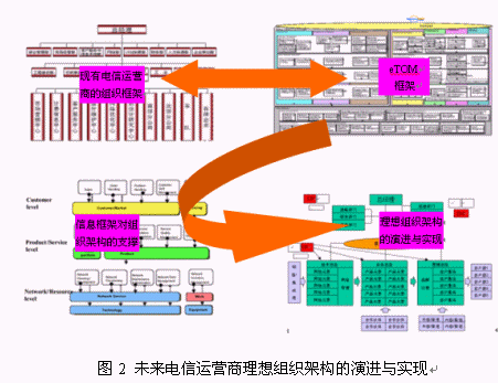 現(xiàn)有的電信運(yùn)營商的管理架構(gòu)向理想的管理組織架構(gòu)演進(jìn)過程中,要涉及到不同的中間過程和步驟,對(duì)中間過渡狀態(tài)的評(píng)估和有效實(shí)現(xiàn),是實(shí)現(xiàn)演進(jìn)的關(guān)鍵。現(xiàn)有組織架構(gòu)管理職能的對(duì)應(yīng),業(yè)務(wù)流程的標(biāo)準(zhǔn)化,管理流程的標(biāo)準(zhǔn)化,企業(yè)IT支撐架構(gòu)對(duì)業(yè)務(wù)職能部門的支撐,這些環(huán)節(jié)都是運(yùn)營商應(yīng)該重點(diǎn)考慮的中間內(nèi)容。圖2顯示了未來電信運(yùn)營商理想組織架構(gòu)的演進(jìn)與實(shí)現(xiàn)過程。其中的任何一個(gè)環(huán)節(jié)都是電信運(yùn)營管理研究的核心課題,也直接影響到了電信運(yùn)營管理變革的成敗。