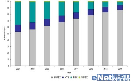隨著中國經(jīng)濟的高速發(fā)展,企業(yè)通信市場也將保持一定的發(fā)展速度。Frost & Sullivan數(shù)據(jù)顯示,從2007年到2014年,國內企業(yè)通信市場年均復合增長率為5.9%,到2014年市場規(guī)模約為4.82億美元。其中,企業(yè)IP通信市場將保持高速發(fā)展態(tài)勢,年均復合增長率將達到13.7%,市場規(guī)模將從2007年的1.71億美元增長到2014年的4.19億美元。屆時,IP通信將擁有整個企業(yè)通信市場86.9%的市場份額。傳統(tǒng)的PBX及KTS市場將持續(xù)萎縮。