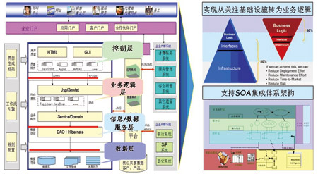 在企業(yè)應用集成上,產(chǎn)品采用了面向服務的組件化設計,遵循SOA體系架構,既支持基于服務的企業(yè)IT系統(tǒng)在數(shù)據(jù)、服務、流程等各個層面有效協(xié)同,也支持對各種遺留系統(tǒng)采用各種傳統(tǒng)的接口方式進行集成。