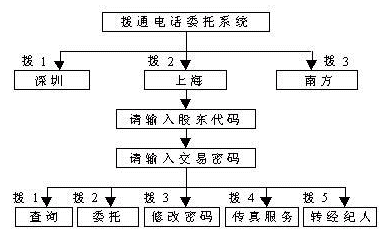 通過(guò)該項(xiàng)服務(wù),股民可以在任何地點(diǎn)使用任何一部雙音頻電話(huà)方便的向證券公司發(fā)出買(mǎi)入、賣(mài)出等各種委托指令,也可以發(fā)出查詢(xún)指令,證券公司的電話(huà)委托交易系統(tǒng)根據(jù)股民的指令自動(dòng)完成委托及查詢(xún)操作,將結(jié)果反饋給股民。股民發(fā)給證券公司的信息,主要為數(shù)碼、數(shù)字,通過(guò)雙音頻電話(huà)按鍵來(lái)傳送。證券公司電話(huà)委托交易系統(tǒng)發(fā)給股民的信息,則是用語(yǔ)音傳送的操作及查詢(xún)結(jié)果。通過(guò)功能擴(kuò)充,還可提供其它配套服務(wù),如將查詢(xún)結(jié)果發(fā)送至股民的傳真機(jī)。若股民利用計(jì)算機(jī)接至委托公司,還可享受可視委托等更為多樣的服務(wù)。