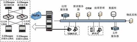 系統(tǒng)整體采用集中式架構(gòu),呼叫中心平臺(tái)采用東進(jìn)公司基于Yessoe技術(shù)開發(fā)的Seegoe多媒體交換機(jī)和Seegoe通信服務(wù)器。呼叫中心平臺(tái)與物流公司內(nèi)部的物流管理系統(tǒng)(如LM、SCM)通過TCP/IP進(jìn)行結(jié)合。呼叫中心系統(tǒng)具有豐富的媒體資源和強(qiáng)大的處理能力,并提供功能模塊的N+1全冗余備份,滿足了高負(fù)荷、大并發(fā)和關(guān)鍵業(yè)務(wù)的可靠運(yùn)營。其次,Seegoe呼叫中心平臺(tái)在媒體交換層以全新的IP架構(gòu)實(shí)現(xiàn)網(wǎng)絡(luò)融合、應(yīng)用融合和業(yè)務(wù)融合,能夠很好的滿足電視購物行業(yè)對呼叫中心的要求。