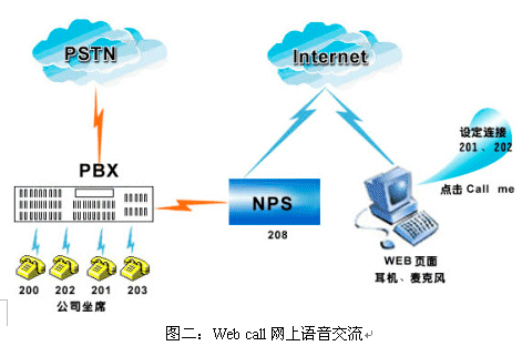 “無聲”一直是企業(yè)電子商務(wù)的最大遺憾,因為“無聲”,許多消費者卻步了。怎樣把語音和Web在網(wǎng)絡(luò)上結(jié)合起來?這正是星際網(wǎng)絡(luò)推出的web call系統(tǒng)(如圖二所示)的目標(biāo)。消費者點擊點擊呼叫按鈕,就可以通過麥克風(fēng)與客服代表通話。并且網(wǎng)上來電與普通來電一樣,經(jīng)過交換及排隊處理,同樣支持來電資料彈出。對客戶來說,只需要一臺接入Internet的多媒體電腦和免費的客戶端軟件就可實現(xiàn)Web瀏覽和交談功能。這個功能不僅可以讓客戶獲得更好的售后服務(wù),在售前服務(wù)中也可以發(fā)揮巨大效用。家電產(chǎn)品的特性使得消費者在購買之前必須對產(chǎn)品有充分了解,在網(wǎng)站瀏覽中通過與客戶代表的交流增進產(chǎn)品了解,刺激其購買欲望。讓家電行業(yè)的網(wǎng)上商務(wù)的更有效。