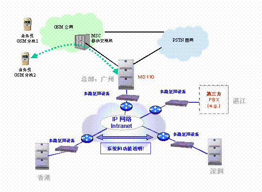 經公司授權的業(yè)務人員在客戶現(xiàn)場辦理業(yè)務時, 簡化了撥打某一個連接公司交換系統(tǒng)的專用號碼,經身份認證后再撥打長途的過程,他們可以直接用已注冊好的手機象普通分機一樣進行長途通話.外地業(yè)務人員的手機與公司總部及各分支機構的通話均通過公司專網(VoIP),節(jié)約了長途通信費用。