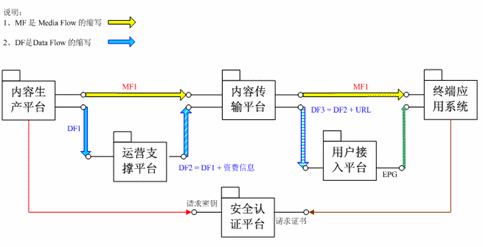 系統(tǒng)根據功能可分成內容制作、節(jié)目傳輸、安全認證、計費營業(yè)、接入處理和終端六個部分。整個系統(tǒng)始終貫穿媒體流和數(shù)據流,確保各個部分能夠有效的協(xié)作。