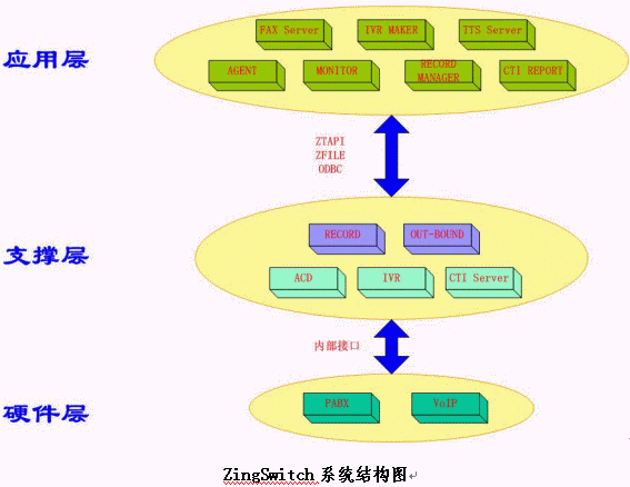 在以上三層結(jié)構(gòu)中,前兩層與具體業(yè)務系統(tǒng)無關(guān)。上層業(yè)務系統(tǒng)的多種變化,不會影響下層的穩(wěn)定;而下層規(guī)范地進行優(yōu)化和擴展后,上層的所有應用都可在業(yè)務功能上得到擴展。這樣,用戶的業(yè)務應用系統(tǒng)自身可以有多種功能和性能的變動和擴展,同時,當基于ZingSwitch一體化交換機的呼叫中心系統(tǒng)平臺在進行擴容、升級的時候,原來已經(jīng)無縫掛接其上的用戶的業(yè)務應用系統(tǒng)也無需任何更改即可運行。