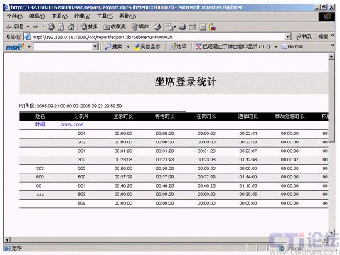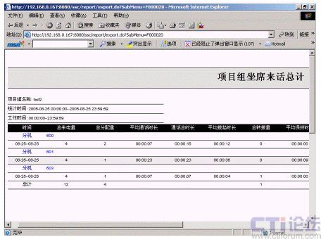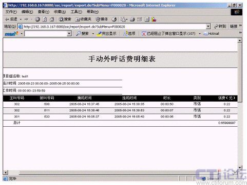 2.項目組外撥分析:包括手動外呼話費(fèi)明細(xì)表、手動外呼話費(fèi)總計表、項目組手動外呼日報告、項目組自動外呼日報告、項目組座席外撥總計、自動外呼話費(fèi)明細(xì)表、自動外呼話費(fèi)總計表、座席外呼日報告等。該統(tǒng)計報表分別提供了針對手動和自動的外撥話務(wù)、話費(fèi)統(tǒng)計,分類明確,統(tǒng)計方便。