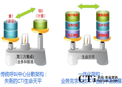 因此很長一段時(shí)間以來呼叫中心都作為語音通訊的分支之一而存在,而這種定位給呼叫中心的生命力帶來了不平衡的發(fā)展,根源就在于“輕C重T第三方集成I”的格局:語音處理性能和功能強(qiáng)大,計(jì)算能力和數(shù)據(jù)處理弱,因此將業(yè)務(wù)集成和數(shù)據(jù)集成交由第三方承擔(dān)。因此很長一段時(shí)間,造成呼叫中心在企業(yè)購買之后對(duì)業(yè)務(wù)應(yīng)用的適應(yīng)能力差、業(yè)務(wù)發(fā)展和變化時(shí)系統(tǒng)穩(wěn)定性變的無法保證。