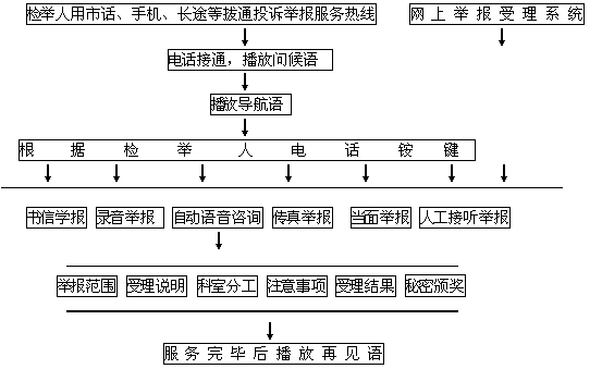 導(dǎo)航語(yǔ):咨詢有關(guān)投訴舉報(bào)受理范圍請(qǐng)按1,咨詢有關(guān)受理說(shuō)明請(qǐng)按2,咨詢科室分工請(qǐng)按3,咨詢投訴舉報(bào)注意事項(xiàng)請(qǐng)按4,咨詢書信舉報(bào)請(qǐng)按5,咨詢當(dāng)面舉報(bào)請(qǐng)按6,電話錄音舉報(bào)請(qǐng)按7,傳真舉報(bào)請(qǐng)按8,人工接聽(tīng)舉報(bào)請(qǐng)按9,查詢舉報(bào)處理結(jié)果請(qǐng)按0