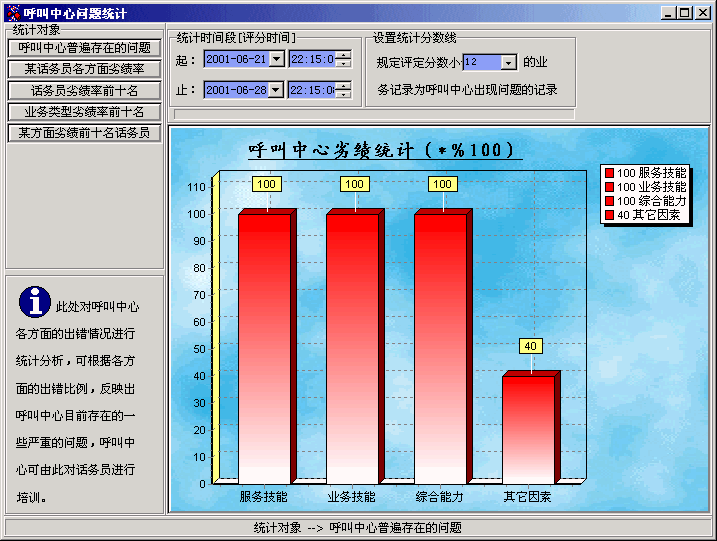 下圖為AP Suite的呼叫中心劣績統(tǒng)計圖,通過此統(tǒng)計可以了解到呼叫中心目前存在的一些問題,從而對話務(wù)員進行針對性的培訓(xùn)。