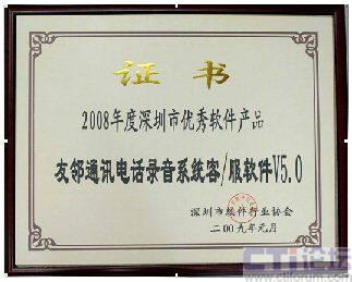 2009年1月,友鄰?fù)ㄓ嶋娫掍浺粝到y(tǒng)客/服軟件V5.0 榮獲由深圳市軟件行業(yè)協(xié)會頒發(fā)的“2008年度深圳市優(yōu)秀軟件產(chǎn)品”榮譽(yù)證書!2008年度深圳市優(yōu)秀軟件產(chǎn)品”的評選是深圳市軟件行業(yè)協(xié)會在全市范圍內(nèi)舉辦的軟件產(chǎn)品推優(yōu)活動,經(jīng)過了企業(yè)申報(bào)、技術(shù)資料審核、專家評審等等幾大嚴(yán)格篩選程序。
