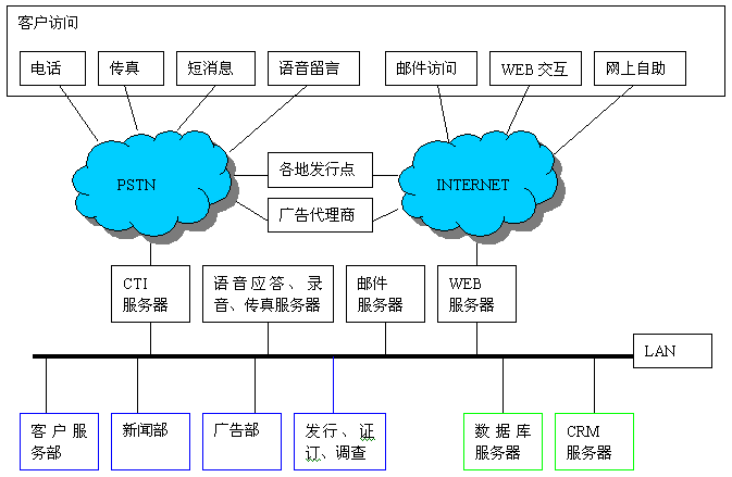 硬件方面,采用價格經(jīng)濟(jì)、功能靈活的基于語音板卡的呼叫中心平臺。在軟件方面,采用高可靠性的實(shí)時LINUX操作系統(tǒng)。具有高效、穩(wěn)定、安全以及功能齊全等特點(diǎn)。坐席端軟件實(shí)現(xiàn)了強(qiáng)大電話處理功能,支持實(shí)時錄音、兼聽、強(qiáng)插、強(qiáng)拆等應(yīng)用;跒g覽器的瘦客戶端與CRM的客戶界面完美融合。并且提供詳盡的報(bào)表功能。支持智能化路由、多種排隊(duì)策略的選擇,實(shí)現(xiàn)與CRM無縫結(jié)合。