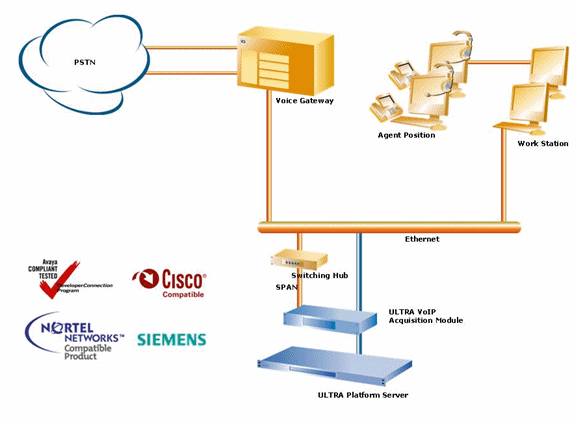 ULTRA平臺(tái)的VoIP錄音方案可真正實(shí)現(xiàn)純軟件解決方案,可由客戶自行配置符合要求的錄音服務(wù)器,安裝ULTRA平臺(tái)的軟件即可。另外,對(duì)于不能提供具備SPAN功能的網(wǎng)絡(luò)使用環(huán)境,ULTRA平臺(tái)也可提供相應(yīng)的模塊產(chǎn)品(ULTRA