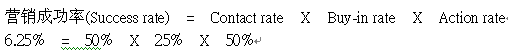 rate(接觸率,能夠聯(lián)系到客戶的比率), Buy-in rate(接受率,聯(lián)系到的客戶里面表達(dá)有興趣的比率), Action rate(成交率,表達(dá)有興趣的客戶里面真正付錢購(gòu)買的比率)。一般而言,接觸率能達(dá)到50%算是不錯(cuò)的名單,而接受率能達(dá)到25%算是產(chǎn)品、名單選擇登對(duì),銷售技巧也到位,最后臨門一腳的成交率應(yīng)該要能到50%算是達(dá)標(biāo)了。以下列公式來(lái)表達(dá)(標(biāo)準(zhǔn)以上述的比率套用):