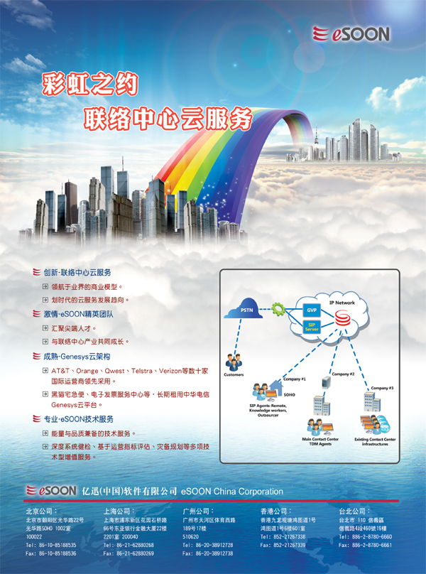 億迅(中國)軟件有限公司:"億迅(中國)軟件有限公司(eSOON)"是eSOON Cayman 集團控股公司與eSOON BVI投資營運公司在中國大陸投資的全資子公司,也是其拓展大中國區(qū)業(yè)務的據點。自2001年在上海成立至今,已在全國各地14個城市設有分公司或辦事處,為超過350家的客戶提供本地化的呼叫中心系統(tǒng)建設和運營管理的專業(yè)服務,其中不乏橫跨各個領域的頂尖企業(yè)。億迅一直秉承客戶至上的服務精神融入企業(yè)的業(yè)務發(fā)展和日常經營中。
