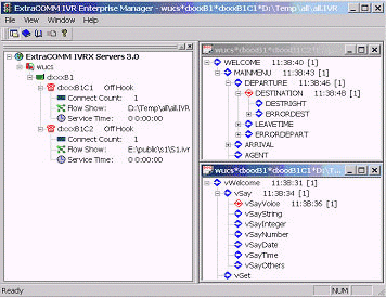 IVR Manager 類(lèi)似 IIS 管理器或 SQL 服務(wù)管理器用來(lái)監(jiān)測(cè)系統(tǒng)狀態(tài). IVR Manager 可運(yùn)行在 NT 服務(wù)相同的機(jī)器上,也可在另外一臺(tái)機(jī)器上運(yùn)行; 它可以用來(lái)管理多個(gè)IVR 服務(wù)器, 其功能如下: