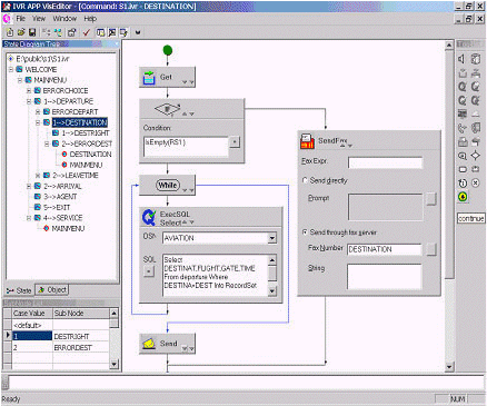 為了最大限度地方便用戶, Visual Editor 為 IVR 腳本的編寫(xiě)提供了一整套可視化的圖形工具. 在它的集成開(kāi)發(fā)環(huán)境中, 你可以執(zhí)行定義一套語(yǔ)音文件, 定義和初始化一些變量, 定義 DSN 和一些記錄集, 加入新結(jié)點(diǎn)等操作.