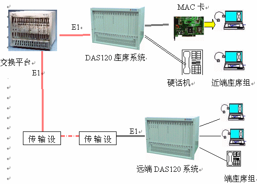 DAS120交換平臺采用1-4個E1連接,可以簡潔實現PCM信號轉模擬信號引出到座席。E1接口的信令可選配為隨路信令CAS和透明通道Clear Channel。E1可通過光端機、微波、HDSL等設備來傳輸,從而實現分布式組網。